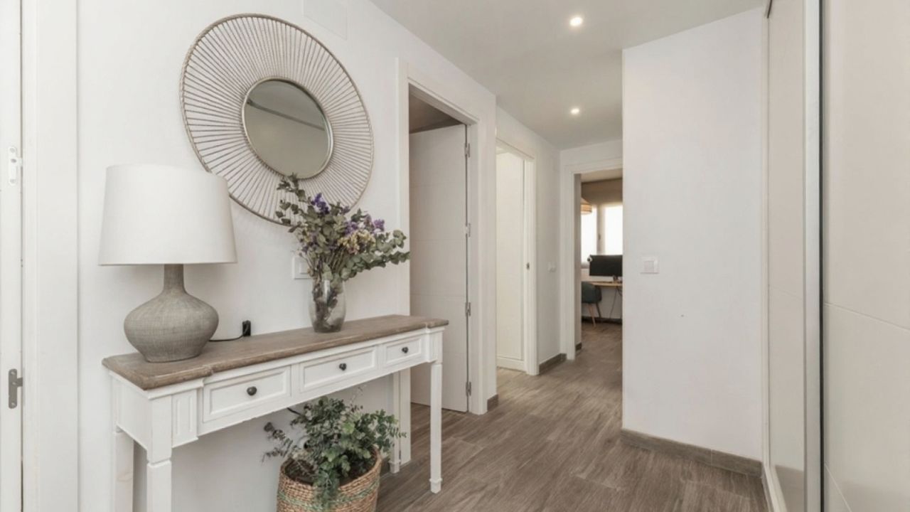 A mirror earns its spot: last-look checks, more light bounce, visual depth. Hang it so faces hit the top third, not the chin zone. If your entry is narrow, a simple vertical mirror keeps it feeling open. If it’s wider, a round mirror softens angles and plays nicely with a rectangular console.
