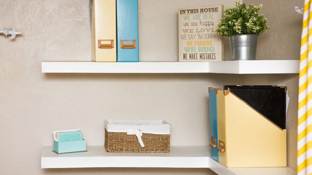 Shelves always look better with a mix of materials. You can find affordable pieces like woven baskets, ceramic vases, and glass jars at thrift stores or dollar shops. A little variety in texture makes everything feel more layered.