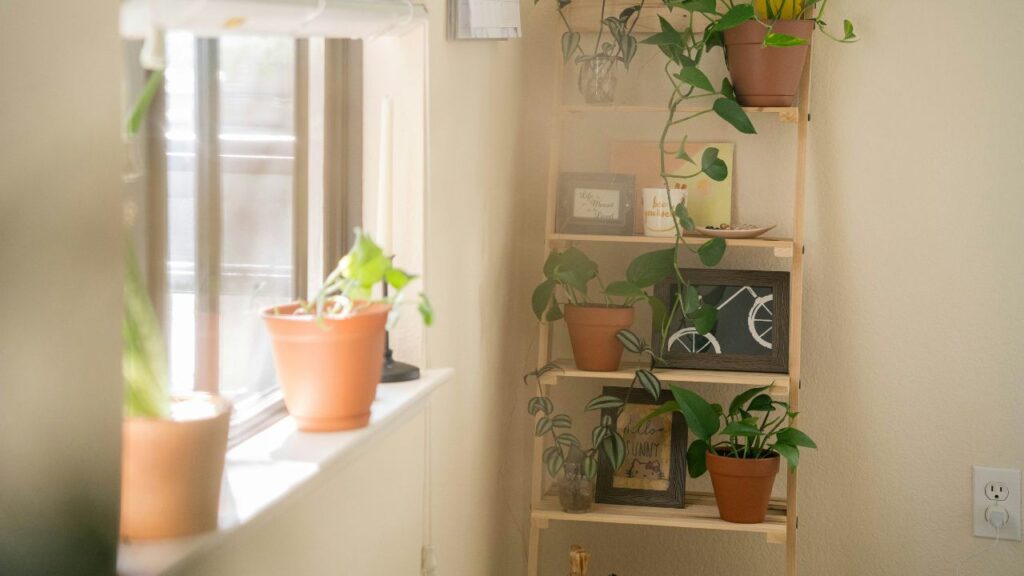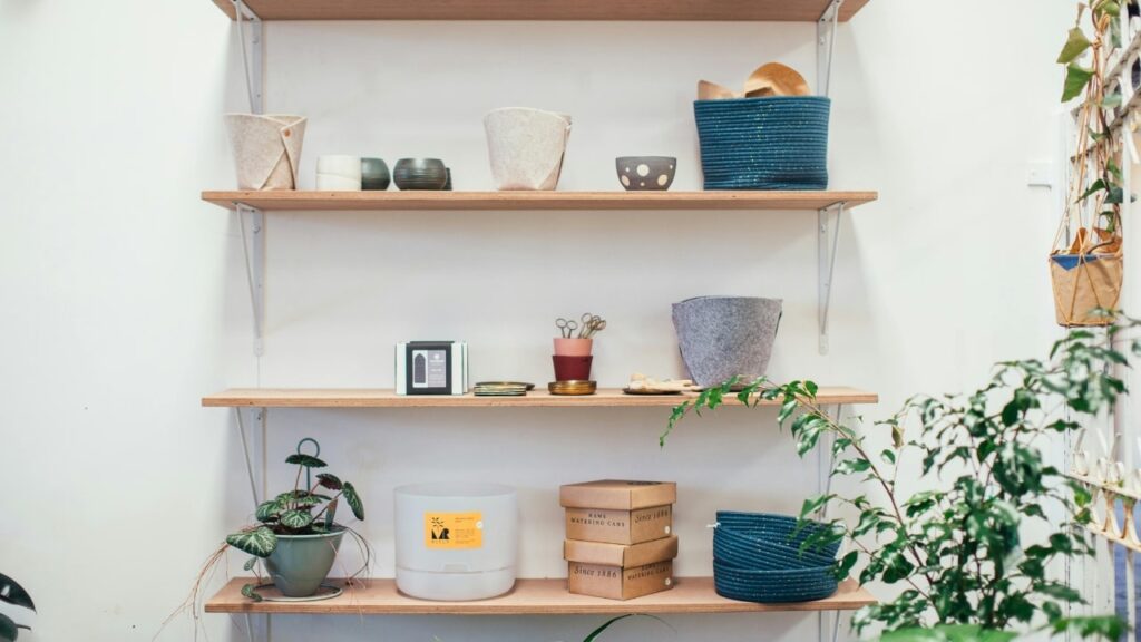 A touch of greenery instantly brings a shelf to life. A $10 plant from Aldi or a faux trailing vine from Amazon can make a big difference. Even a small pot of herbs works well in a kitchen shelf setup.