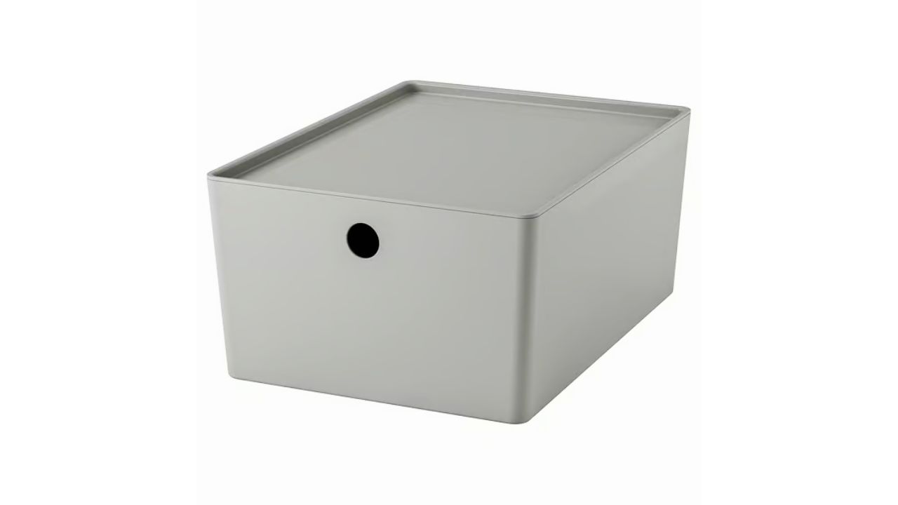 KUGGIS lidded boxes are lifesavers for seasonal linens, extra toiletries, and craft spillover. VARIERA bins are perfect for under-sink zones where you need a handle to pull things out.