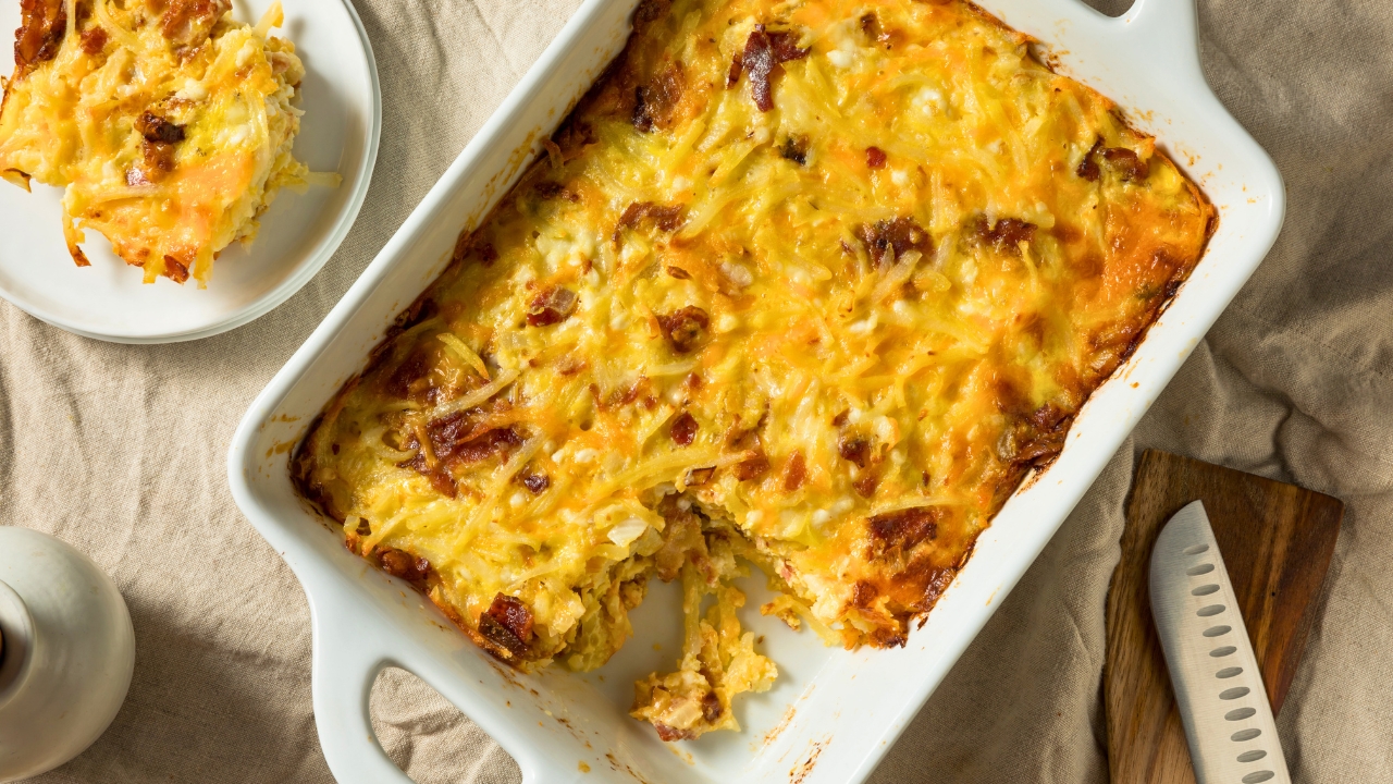 Egg casseroles are perfect for nights you’re low on groceries but still need something filling. Whisk eggs with milk, add cheese, leftover meats (like sausage or ham), and any vegetables you have on hand. Pour over cubed bread or hash browns in a dish and bake. It’s a good way to use up the last bits of cheese and produce sitting in the fridge.