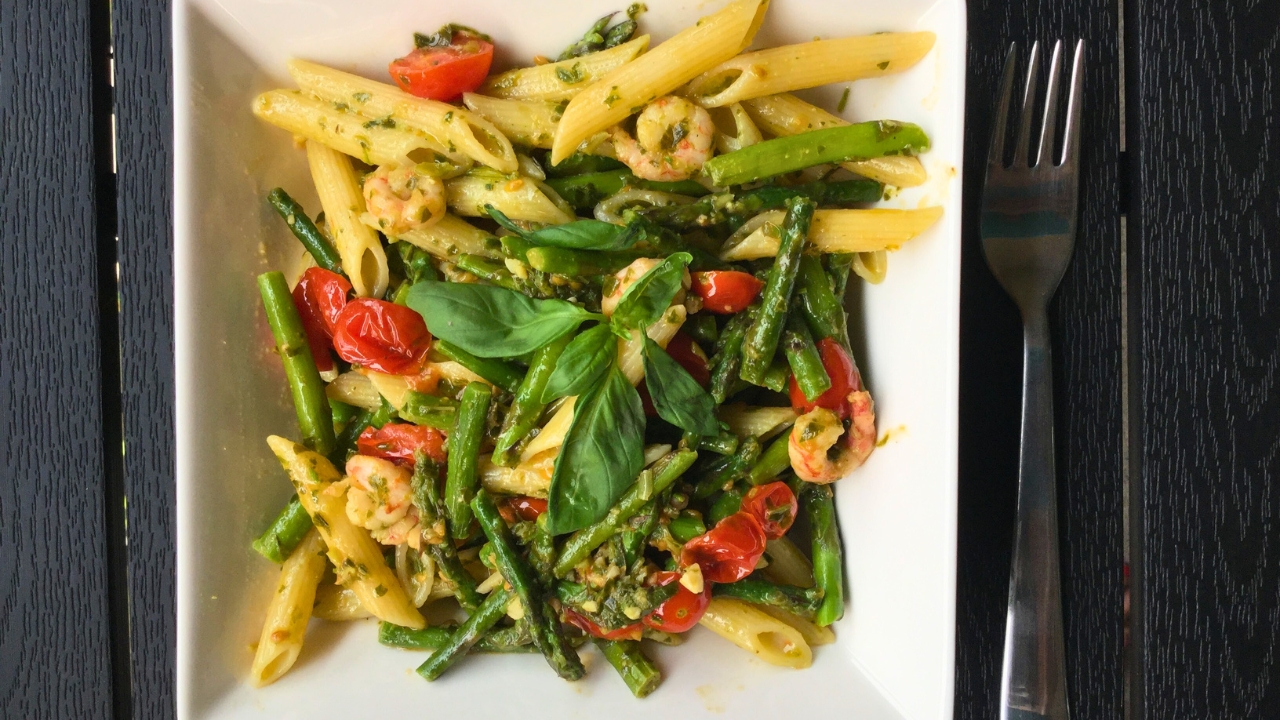 Spread cherry tomatoes and asparagus on a pan, oil and salt, roast five minutes. Add shrimp tossed with pesto and roast just until pink.