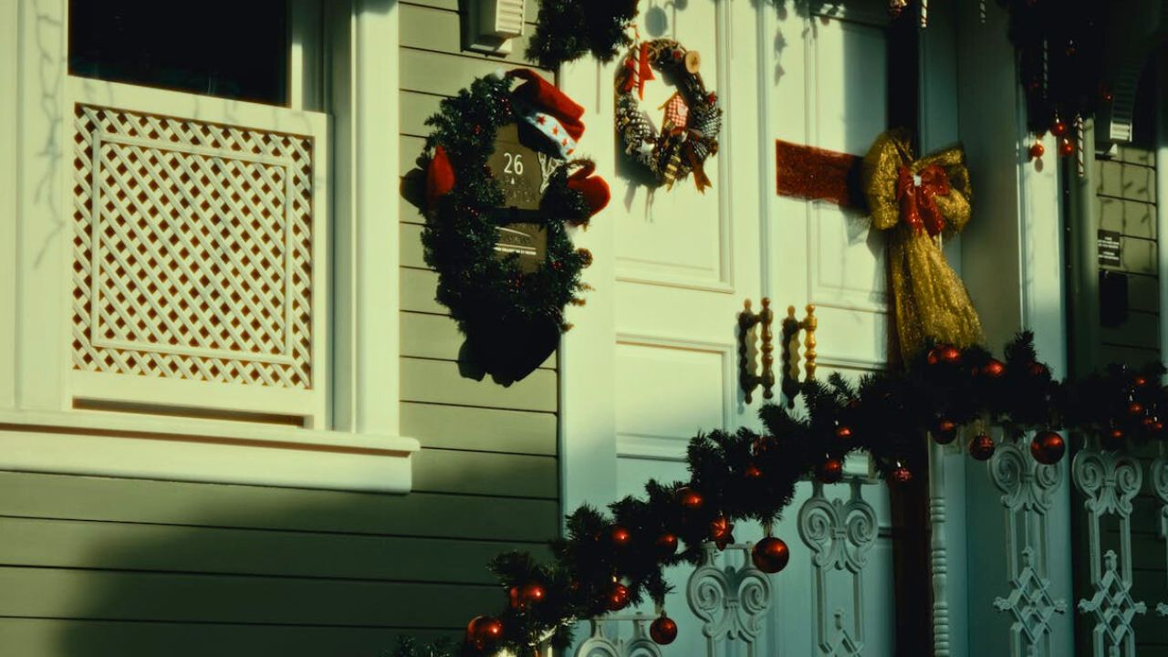 Skip the cluttered swag. A full green wreath with a wide ribbon looks considered and high-end, even if it’s faux. Keep the bow generous and let the tails fall long to add vertical line on a short door.