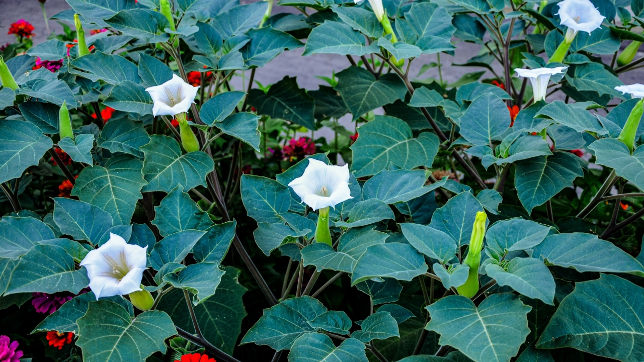 Jimsonweed, also called devil’s trumpet, grows fast in disturbed soil and spreads easily. It has large, trumpet-shaped flowers and spiky seed pods that can look interesting—but the whole thing is highly toxic.