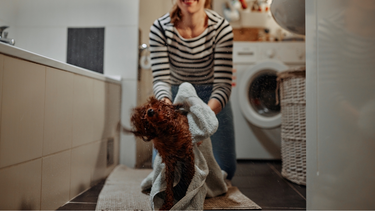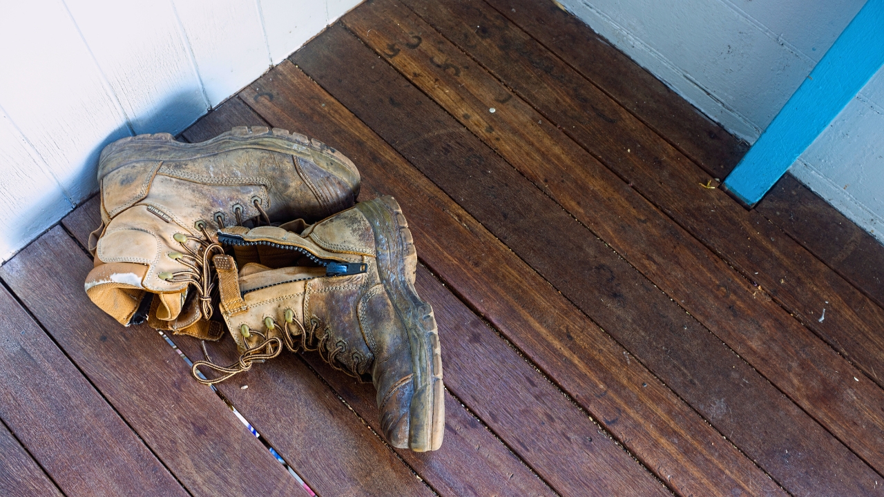 Set up a boot tray or crate by the back door. If it’s wet or nasty out, put a roof over that spot so they stay dry. Keep a clean pair of “inside shoes” if needed.