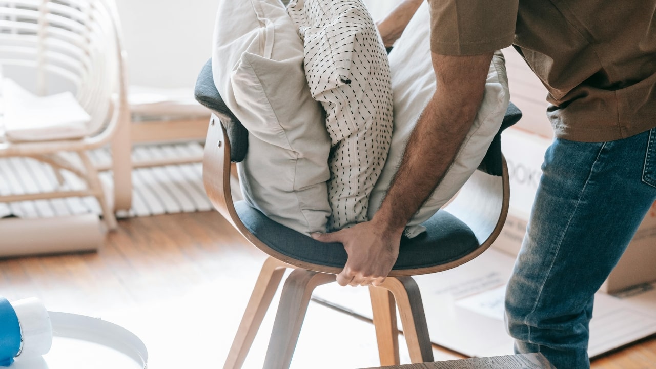 Slide the couch, chairs, or coffee table just enough to get under and behind them. A full rearrange isn’t required. You’re looking for: