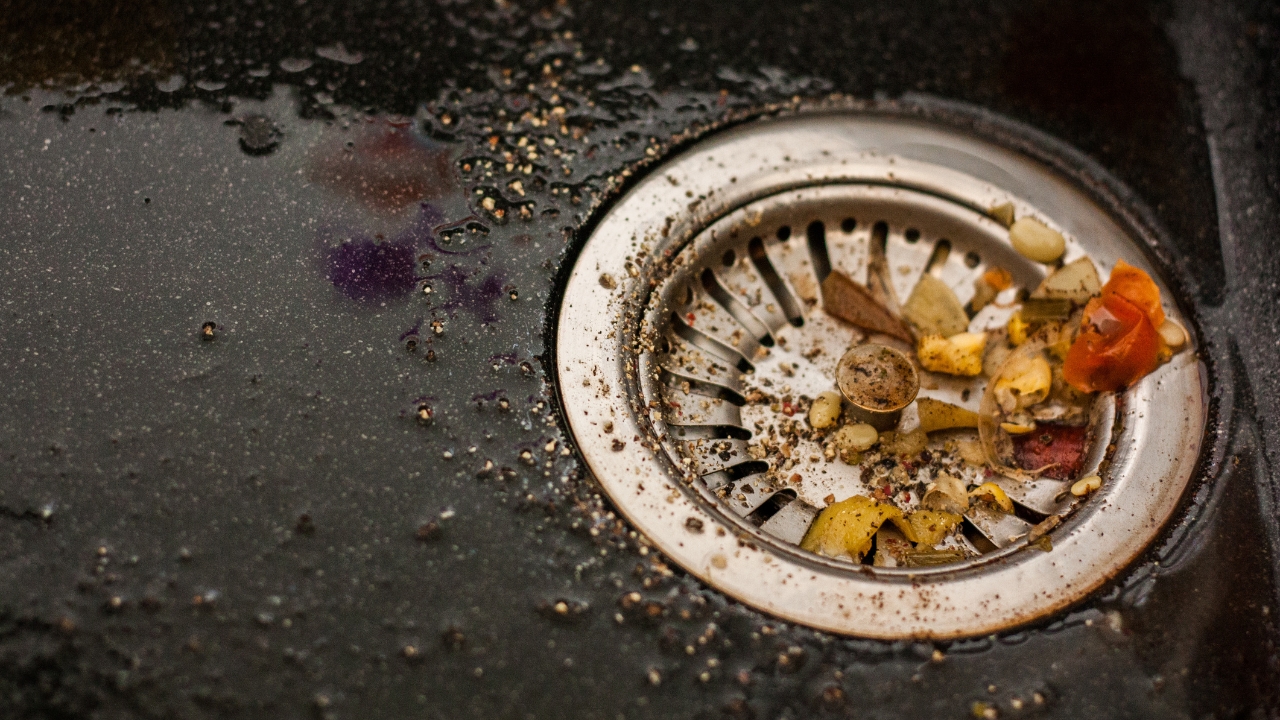 When soap doesn’t rinse clean, it leaves a sticky coating in the drain. That coating is a magnet for small food particles that slip through the strainer.